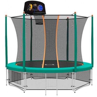 Комплектация - каркас батута, комплект пружин, защитный мат, верхняя защитная сетка, нижняя защитная сетка, лестница, ключ для установки пружин, набор инструментов и крепежей, баскетбольный набор.