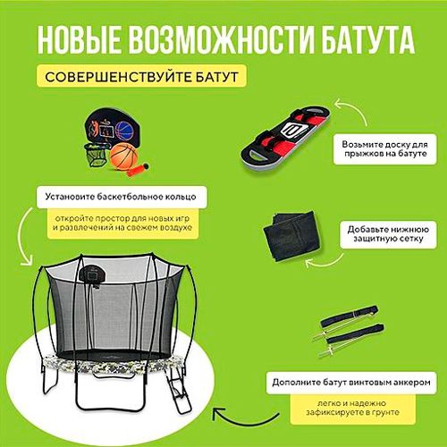 Комплектация - каркас батута, комплект пружин, защитный мат, верхняя защитная сетка, лестница, ключ для установки пружин, набор инструментов и крепежей.